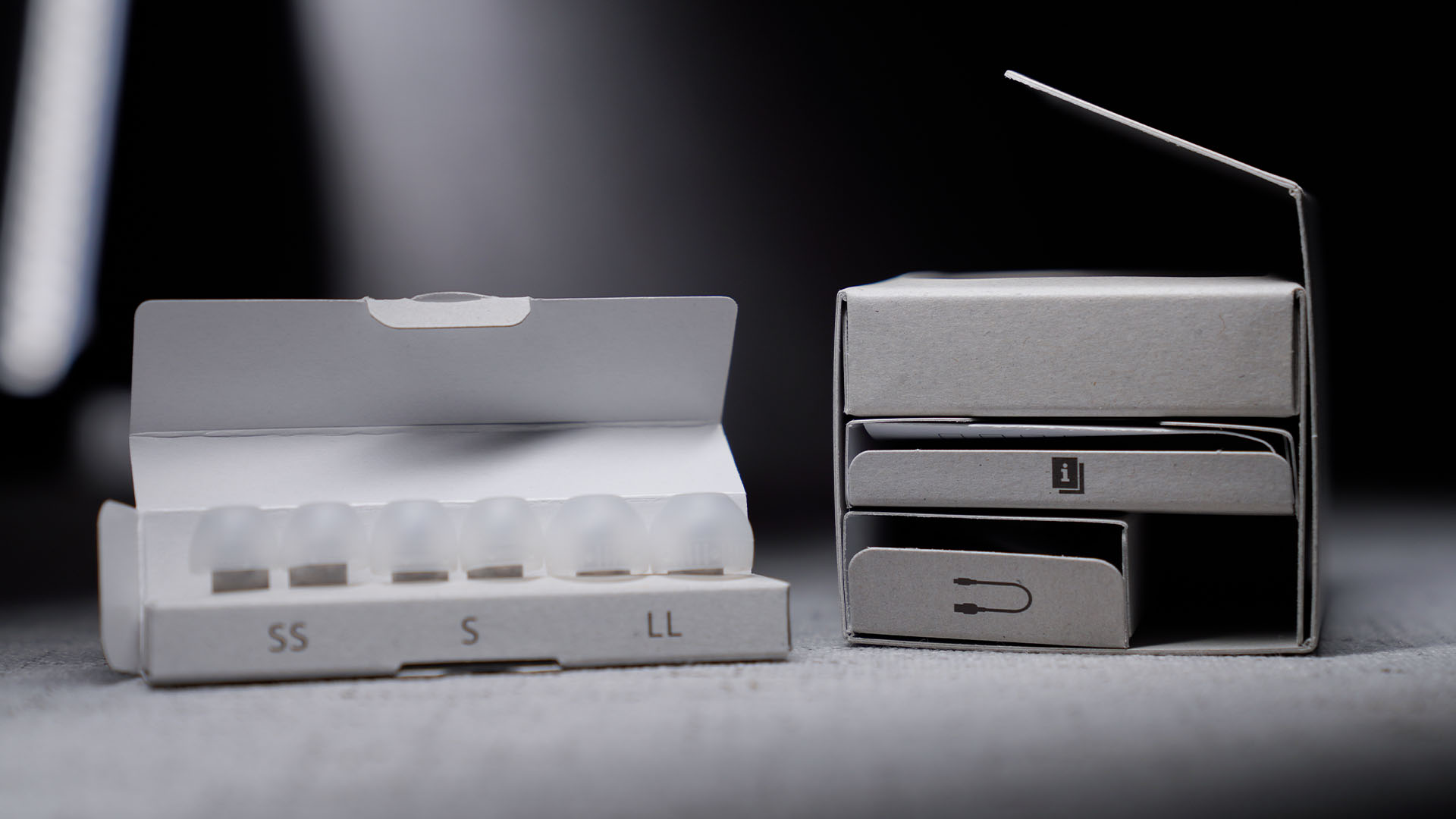 细巧的包装盒顶部设有挂耳,正面印制了产品宣扬图样及称号,包装盒顶部列举了耳机的各项功用特征。底部罗列了产品内包清单:耳机主体一对,充电盒一只,USB Type-C充电线一根,适配耳帽4对(尺度:SS、S、M、LL)。