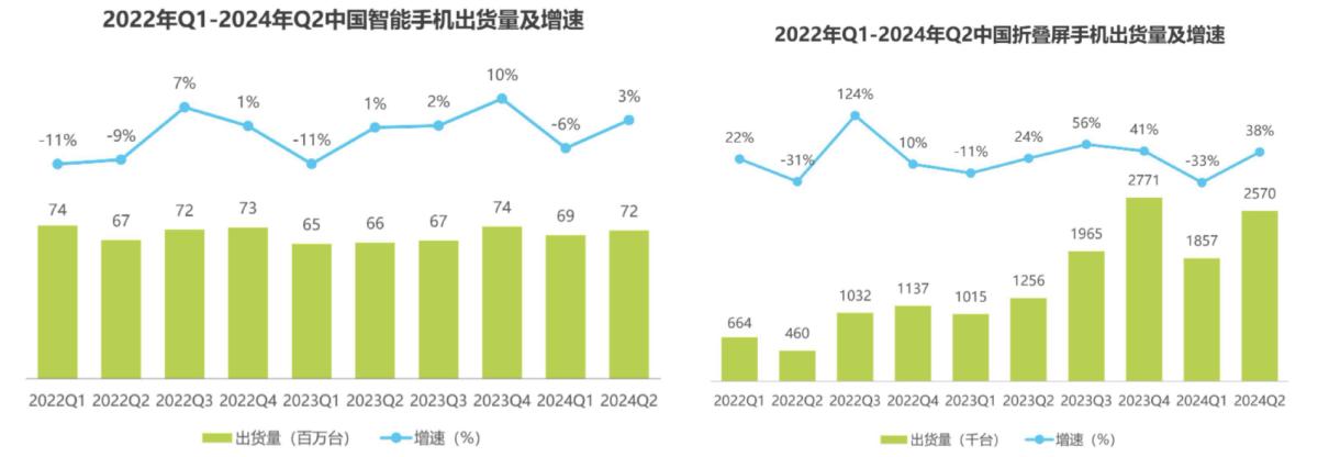 最近,艾瑞咨询发布了《2024年我国折叠屏手机商场与消费趋势研究报告》,数据显现2024年Q2国内智能手机商场的全体瓶颈期仍在继续,增加复苏不及预期。但假如细分到品类的话,能够发现折叠屏手机品类迎来了高速增加——2024年Q2折叠屏手机出货量为257万部,增速高达38%,增速仍旧十分强势。